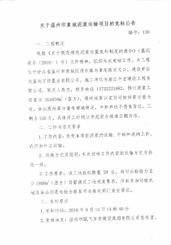 关于温州印象城泥浆运输项目的竞标公告