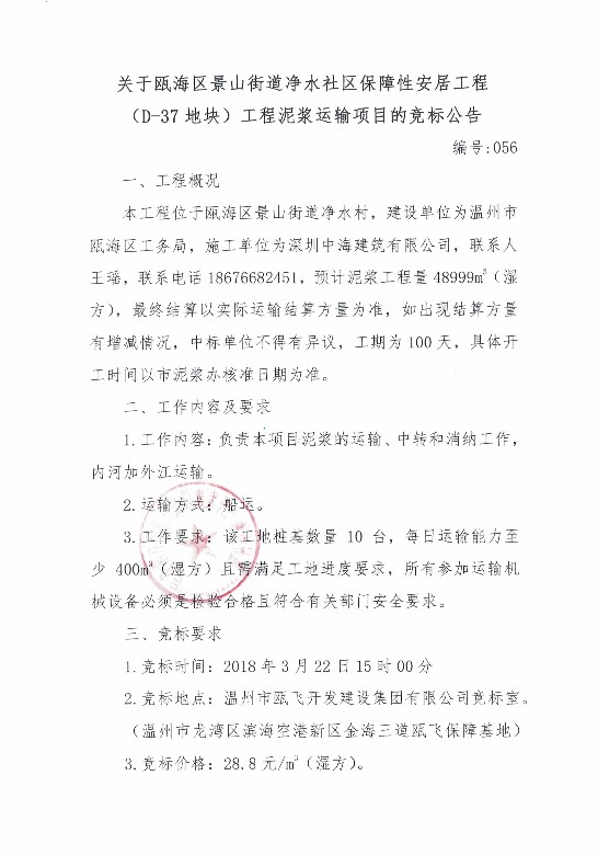 ¹ØÓÚ걺£Çø¾°É½½ÖµÀ¾»Ë®ÉçÇø±£ÕÏÐÔ°²¾Ó¹¤³Ì£¨D-37µØ¿é£©¹¤³ÌÄཬÔËÊäÏîÄ¿µÄ¾º±ê¹«¸æ