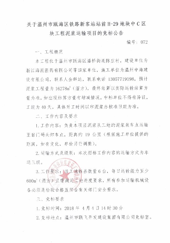 ¹ØÓÚÎÂÖÝÊÐ걺£ÇøÌú·Ð¿ÍվվǰH-29µØ¿éÖÐCÇø¿é¹¤³ÌÄཬÔËÊäÏîÄ¿µÄ¾º±ê¹«¸æ