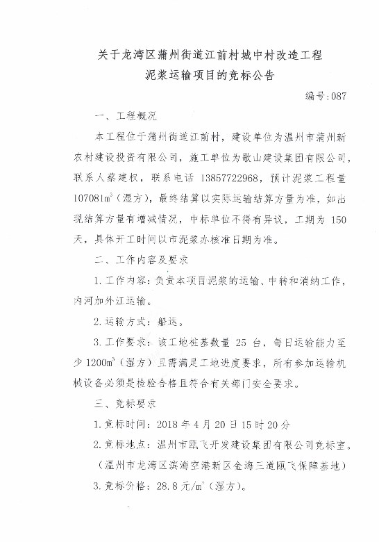 ¹ØÓÚÁúÍåÇøÆÑÖݽֵÀ½Ç°´å³ÇÖдå¸ÄÔ칤³ÌÄཬÔËÊäÏîÄ¿µÄ¾º±ê¹«¸æ