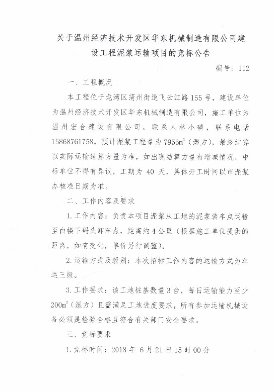 ¹ØÓÚÎÂÖݾ¼Ã¼¼Êõ¿ª·¢Çø»ª¶«»úÐµÖÆÔìÓÐÏÞ¹«Ë¾½¨É蹤³ÌÄཬÔËÊäÏîÄ¿µÄ¾º±ê¹«¸æ